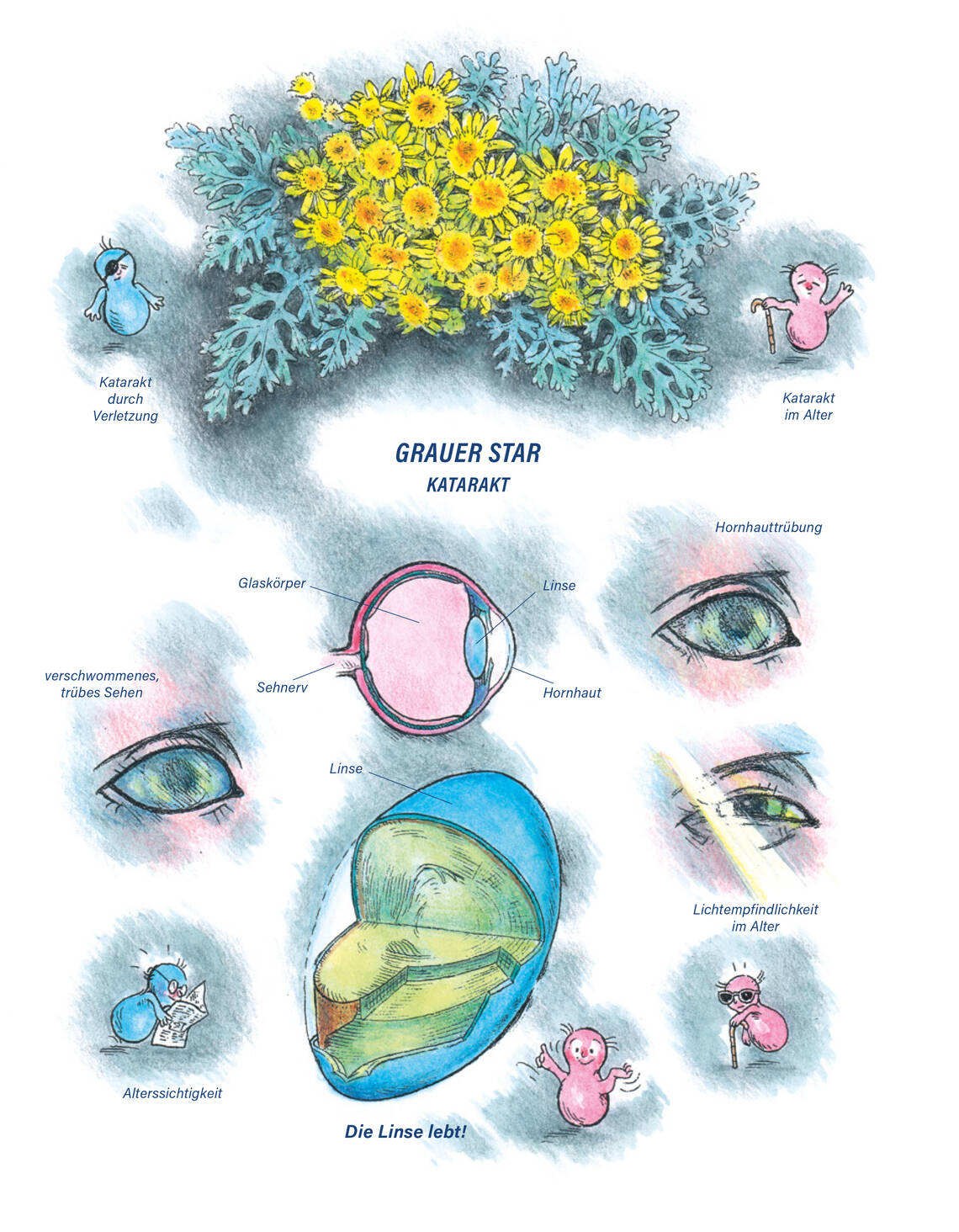 Folgen von Augenverletzungen (Grauer Star). Symptome: Typische Symptome des grauen Stars: Langsamer Verlust der Sehschärfe. Verschwommenes Sehen und Blendungsempfindlichkeit. Sehen «wie durch Nebel». Lichthof (Halos) um Lichtquellen. Erschwertes Sehen in der Dämmerung, Einschränkung des räumlichen Sehens. Bemerkungen: Die Augenlinse ist kein totes Stück Glas. Sie lebt und kann homöopathisch beeinflusst werden. Der berühmte Homöopath Clarke schreibt in seiner Enzyklopädie «Der neue Clarke», dass mit Cineraria Katarakt nach Augenverletzungen, Alterskatarakt und Hornhauttrübungen vermindert werden können. Jahrzehntelange Erfahrungen von Carlo Odermatt mit betroffenen Personen haben Clarkes Aussage bestätigt. Cineraria Augentropfen sind bei ersten Anzeichen von Katarakt und auch vorbeugend empfehlenswert (besonders, wenn in der Familiengeschichte Katarakt vorkommt).