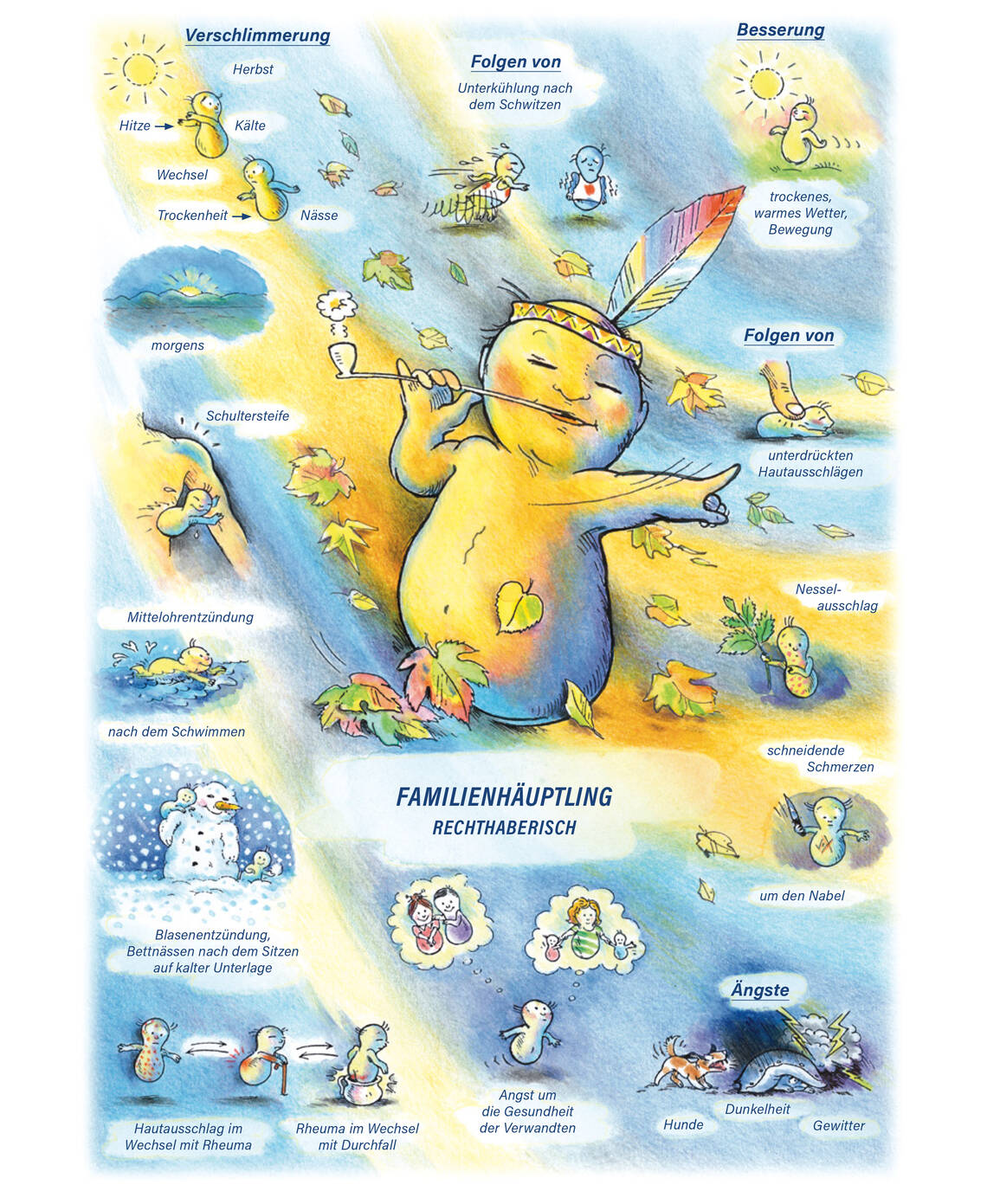 Augen-Bindehaut-Entzündung nach Schwimmen oder bei Regenwetter / Fieberblasen, wunde Lippen bei geringster Kälte / Durchfall mit Nabelschmerz (im Sommer) / Bettnässen nach Durchnässung.