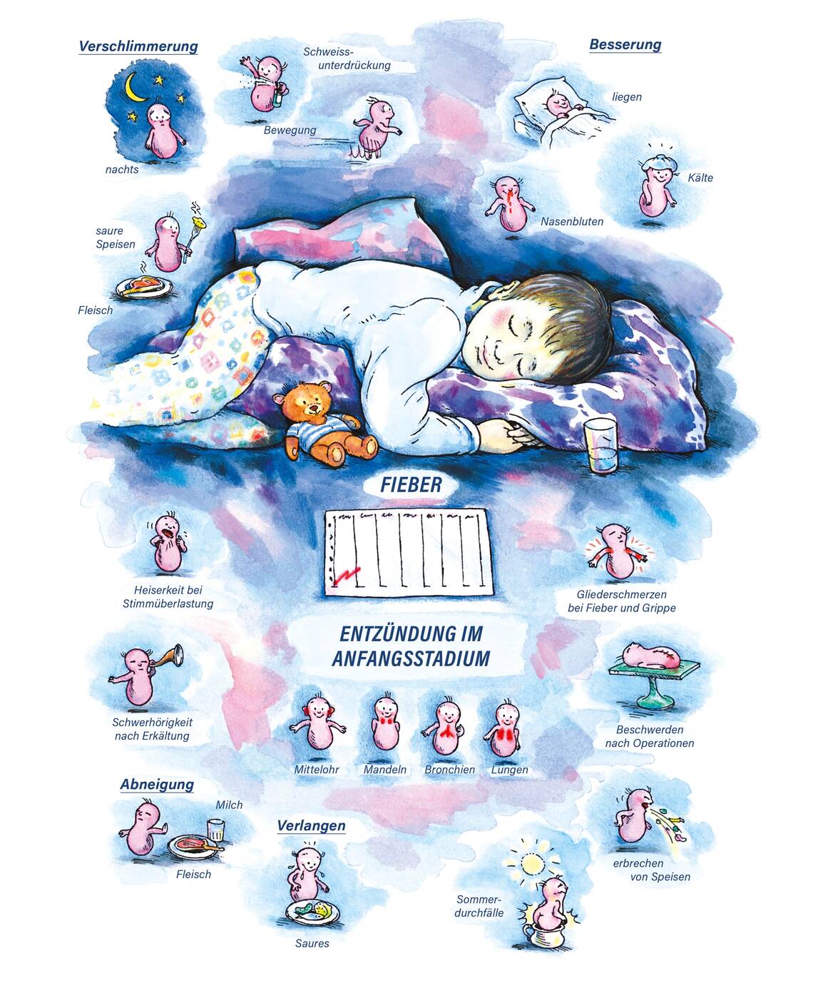 Wichtiges Kindermittel / Frieren und Hitze im Wechsel. Frösteln mit Durst, gefolgt von Hitze ohne Durst / Grosse Müdigkeit, Schwäche (Patient will liegen). Kein oder nur wenig Schweiss / Abneigung gegen Eier.