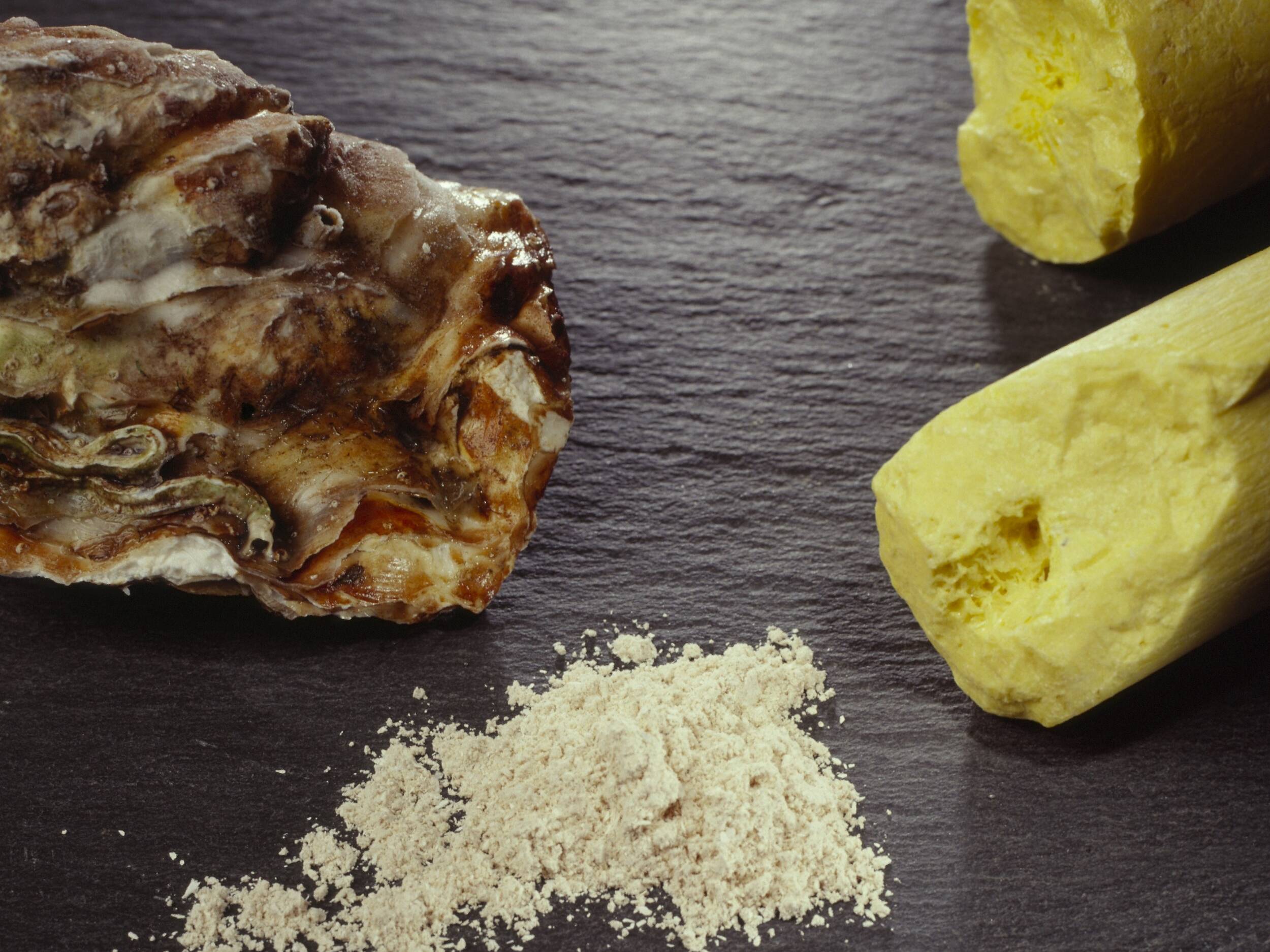 verwendeter Teil: weisser Austernschalenkalk und weisse Schwefelblumen werden in einem Tiegel erhitzt