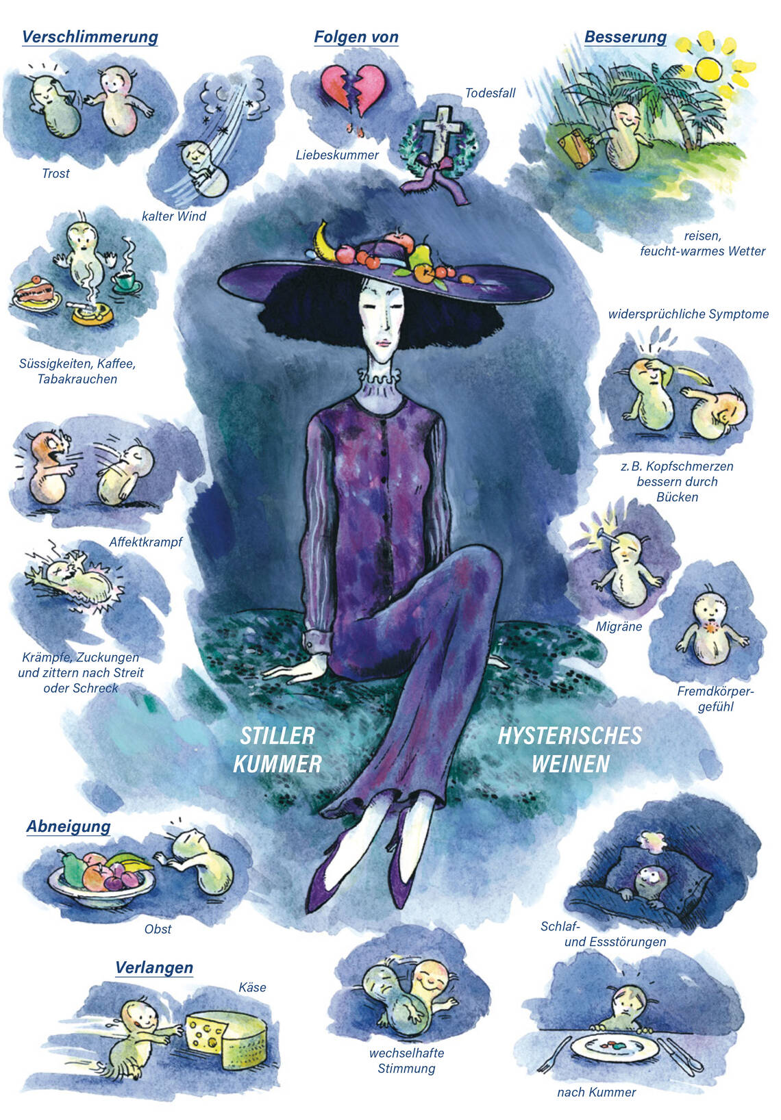 Die meisten Beschwerden sind auf Kummer und Schreck zurückzuführen. Symptome sind oft widersprüchlich (z. B. Kopfweh besser durch Bücken, Heisshunger bei Kummer, Magenschmerzen besser durch Essen usw.) / Abneigung gegen Obst und Gemüse.