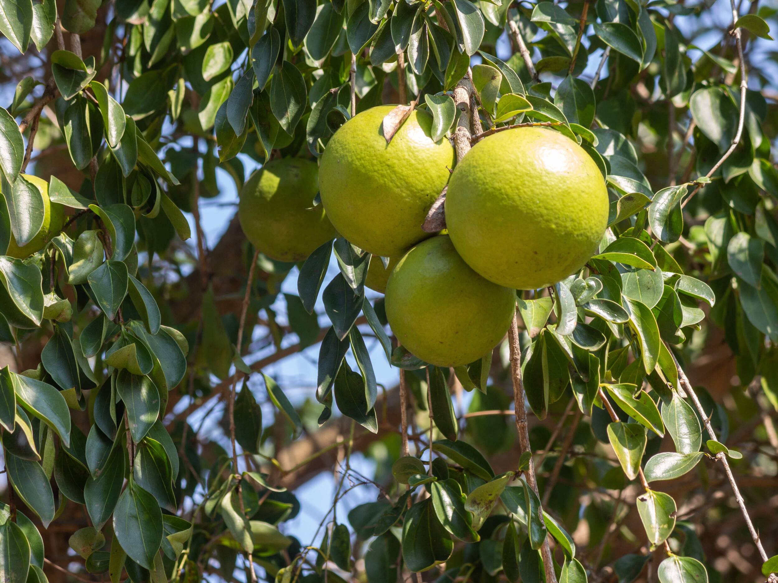 Beschreibung: Der rankende Kletterstrauch wird bis zu 20 m hoch und bildet einen bis 10 cm dicken Stamm aus. Seltener wächst die Pflanze als Strauch oder kleiner Baum. Die breiteiförmigen oder elliptischen Blätter werden bis 25 cm lang und sind gegenständig angeordnet. Die fünfzähligen, grünlichen und weissbehaarten Blüten sind zu 10 bis 20 in dichten, blattachselständigen Blütenständen angeordnet. Die Früchte sind goldgelbe, bis 13 cm breite kugelige Beeren mit bis zu 40 Samen im Fruchtfleisch. Blütezeit: Januar bis September