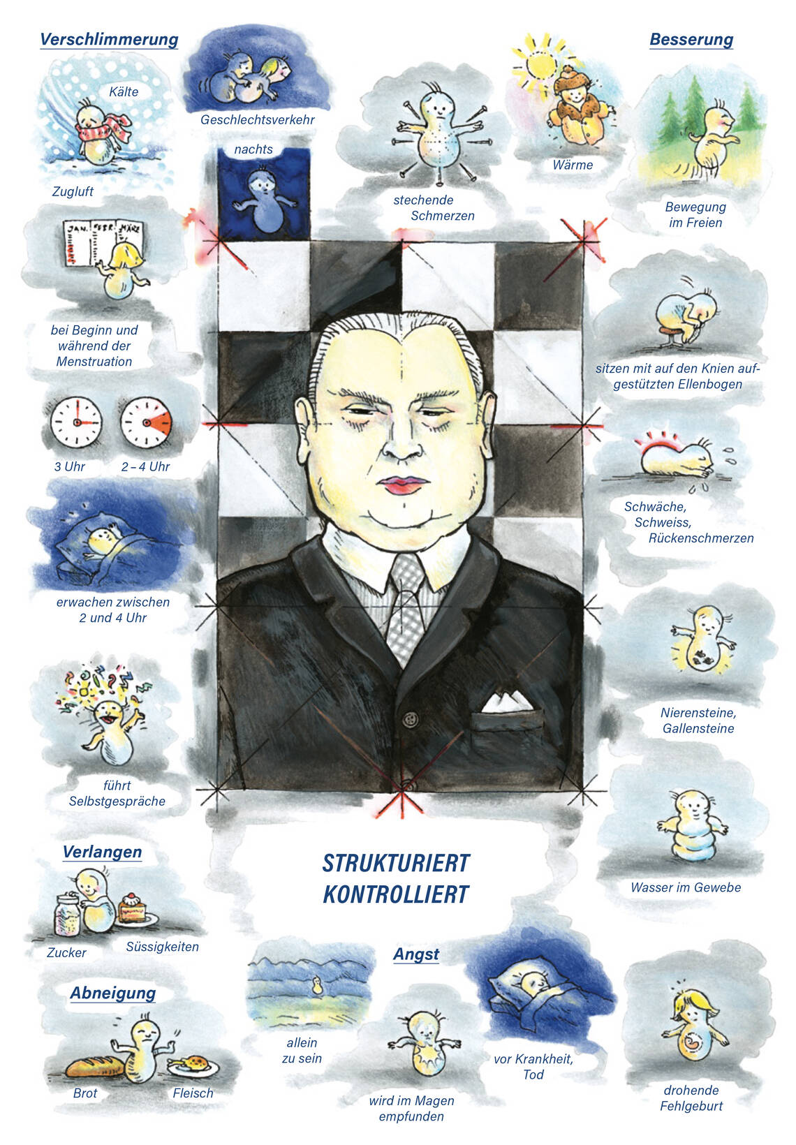 Nun wollen wir uns speziell mit Kalium carbonicum befassen. Unser Bild zeigt einen ziemlich massiven und aufgeschwemmten Mann. Die für Kalium carbonicum typischen Schwellungen am inneren Winkel der oberen Augenlider (wie kleine Kissen) haben wir etwas überzeichnet, damit sie nicht übersehen werden. Dieses Zeichen hat uns schon mehrfach zu einer erfolgreichen Verordnung von Kalium carbonicum geführt. Besonders bei Menschen, die sich bei der Konsultation alles andere als mitteilsam verhalten, sind solche Beobachtungen von unschätzbarem Wert. Sogar ‹Kalium-carbonicum-Kinder› sind verschlossen und erzählen nichts spontan. Von der Mutter hören wir, dass sie einen auffälligen Ordnungssinn hätten, sich ärgern, wenn die Dinge nicht genau an dem von ihnen vorgesehenen Platz stehen.