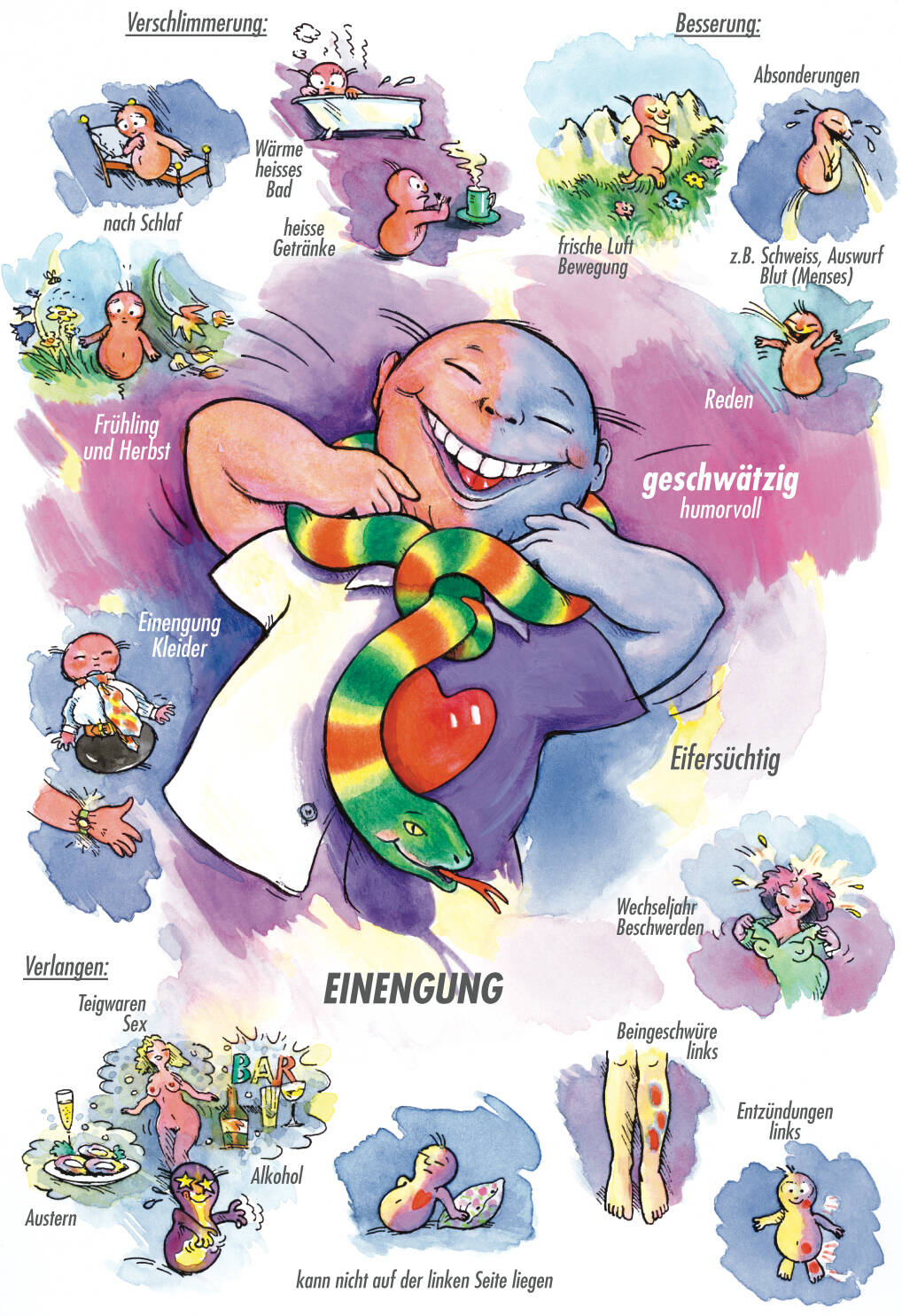 Mit dem Bild der züngelnden Schlange vor Augen können wir uns das Arzneimittelbild besser einprägen: ‹Lachesis-Menschen› können mit «gespaltener Zunge» sprechen, das heisst, sie nehmen es oft mit der Wahrheit nicht so genau (so kursieren viele wilde, offenbar unwahre Geschichten über Herings Umgang mit Schlangen).