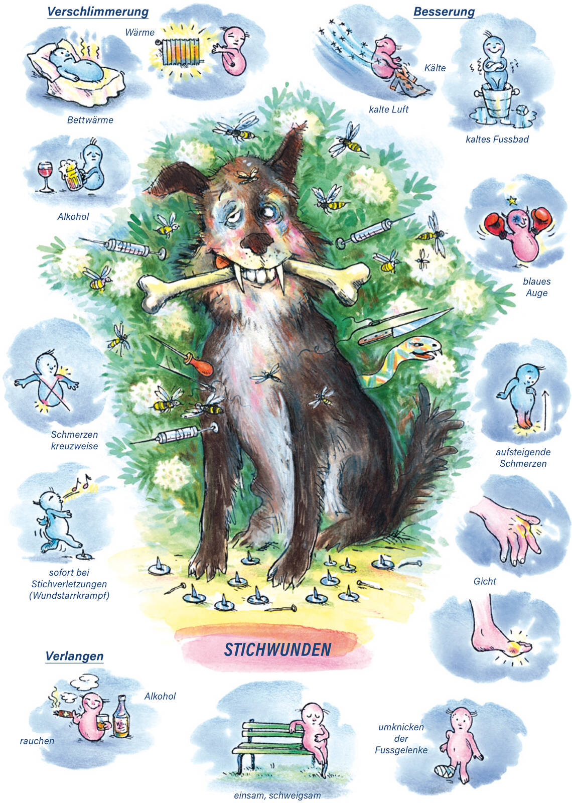 Schlaflosigkeit, wenn warm zugedeckt (trotz kalter Glieder) / Die Gelenkschmerzen ziehen vom Fuss nach oben / Hauptsächlich Schmerzen in den grossen Zehen und im Allgemeinen in den kleinen Gelenken (auch Gichtknoten). Knacken der Gelenke / Stich- und Schnittwunden in den Handund Fussflächen, eiternd (die Haut um die Wunde ist kalt) / Hautjucken, besonders auf dem Fussrücken.