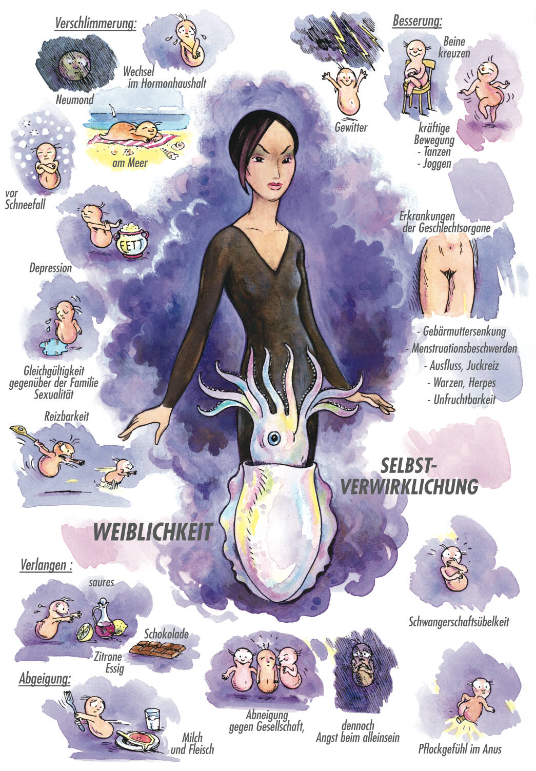 Neigung zu inbrünstigem Beten. Depressive Verstimmung, Traurigkeit und Reizbarkeit, besonders nach Geschlechtsverkehr und während dem Klimakterium. Nervosität, Reizbarkeit und Arbeitswut vor der Menstruation. Frauen sind mal traurig, weinerlich ablehnend (tagsüber, sich selber, Ehemann, Arbeit), mal aufgestellt undauffallend aktiv (abends Drang, körperlich zu arbeiten). Weint beim Reden von der Krankheit. Frauen haben Probleme mit ihrer Weiblichkeit. Fürchten sich vor Einsamkeit, wollen aber trotzdem alleine sein, alleine schlafen / Migräneattacken (oft am Wochenende oder während der Regel) / Herpes hinter den Ohren. Herpes (z.B. Fieberblasen) jeden Frühling. Schmetterlingsförmige, braun-gelbe Pigmentation auf beiden Seiten der Nase / Gefühl, der Magen senke sich / Braune Flecken auf dem Bauch / Scharfer, übelriechender Ausfluss* vor der Regel. Ausfluss, Weissfluss, ätzend bei Mädchen. Starke, übelriechende Schweisse im Genitalbereich und in den Achselhöhlen. Regel zu spät / Kreuzen der Beine beim Sitzen, um die Gebärmutter zurückzuhalten (Gefühl von Herabdrängen im Unterleib) / Akne um den Mund zur Zeit der Menstruation.