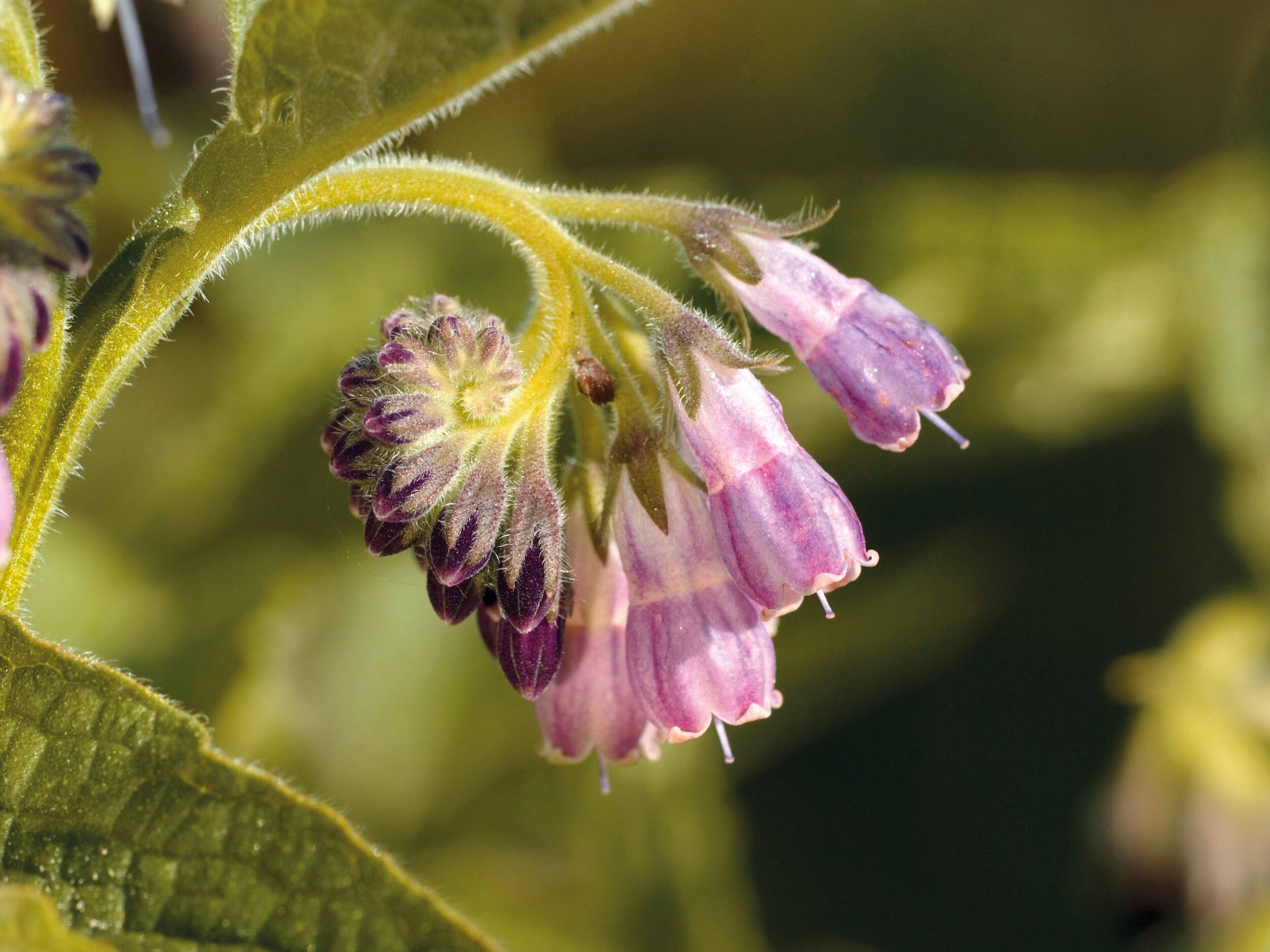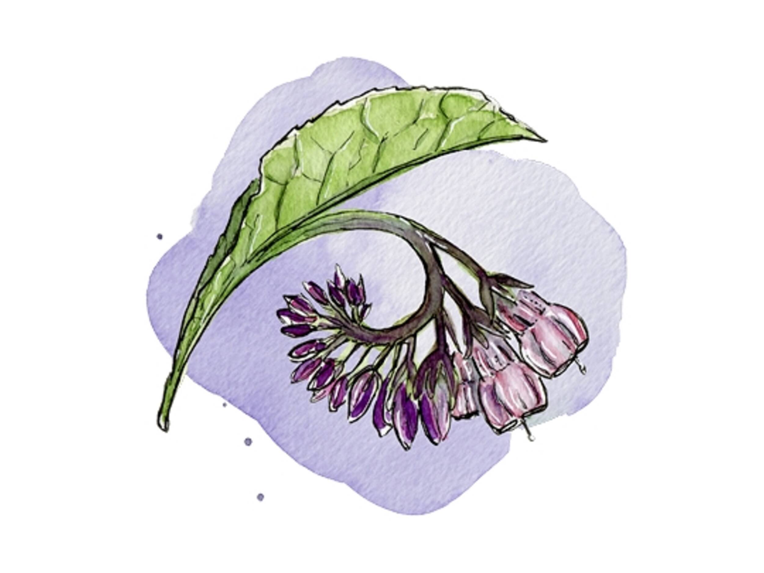 Symphytum (auch Beinwell, Wallwurz) ist eine ausdauernde und mehrjährige Pflanze aus der Familie der Raubblattgewächse. Sie wächst in lehmigen, feuchten Gebieten und bevorzugt halbschattige Standorte mit nährstoffreichen Böden. So sind Acker- und Strassenränder, Wiesen oder Uferränder bekannte Fundorte. Beinwell blüht den ganzen Sommer über und bildet traubenartige Blütenstände mit hängenden, glockenförmigen Blüten, die weisslich, rosa, hell-lila gefärbt sind. Die Blätter sind mit ihrer spitz zulaufenden Form und behaarten Fläche gut von anderen Pflanzen zu unterscheiden. Die Heilpflanze ist in Europa, Westasien und Nordamerika verbreitet und wächst bis auf eine Höhe von 1500 m.ü.M.